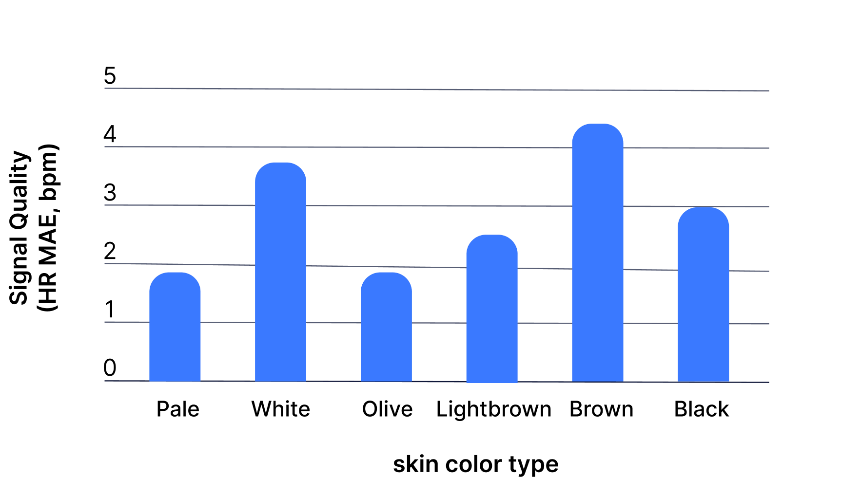 Pour illustrer cela, le graphique ci-dessous montre le taux d'erreur de la fréquence cardiaque (un dérivé direct de la qualité de notre signal) en fonction de la couleur de peau. Un taux d'erreur plus faible indique une meilleure qualité du signal. Pour chaque groupe, ce taux d'erreur reste nettement inférieur au seuil de 5 battements par minute, qui répond aux critères d'acceptation clinique. Plus d'informations.