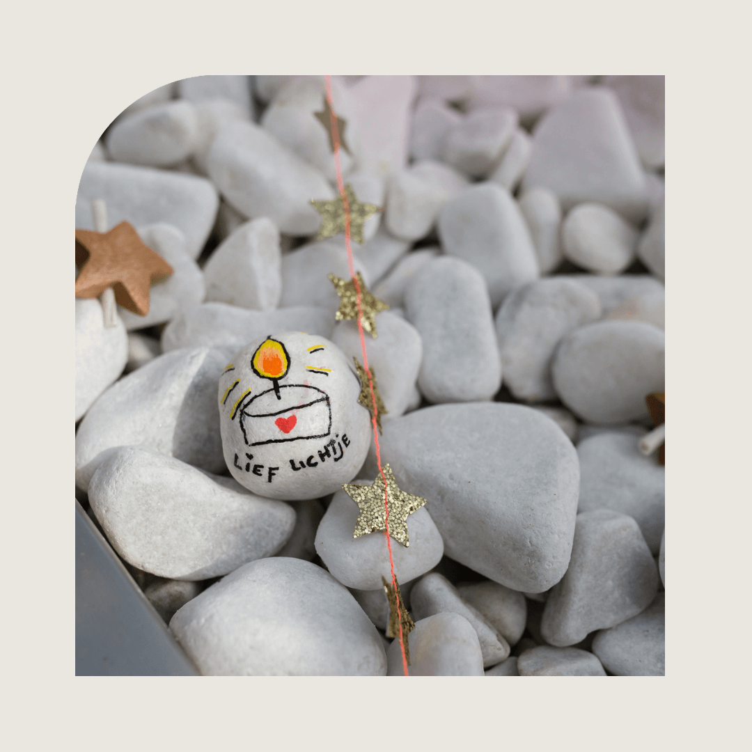 Als Nina jarig is, vieren we haar. Met taart, ballonnen en een klein cadeautje voor op haar graf. We beschilderen steentjes die we bij haar kunnen leggen. We halen altijd een hele grote ballon, met het cijfer van haar leeftijd: nu was dat een grote 10. Die hangen we dan bij haar op het kerkhof.