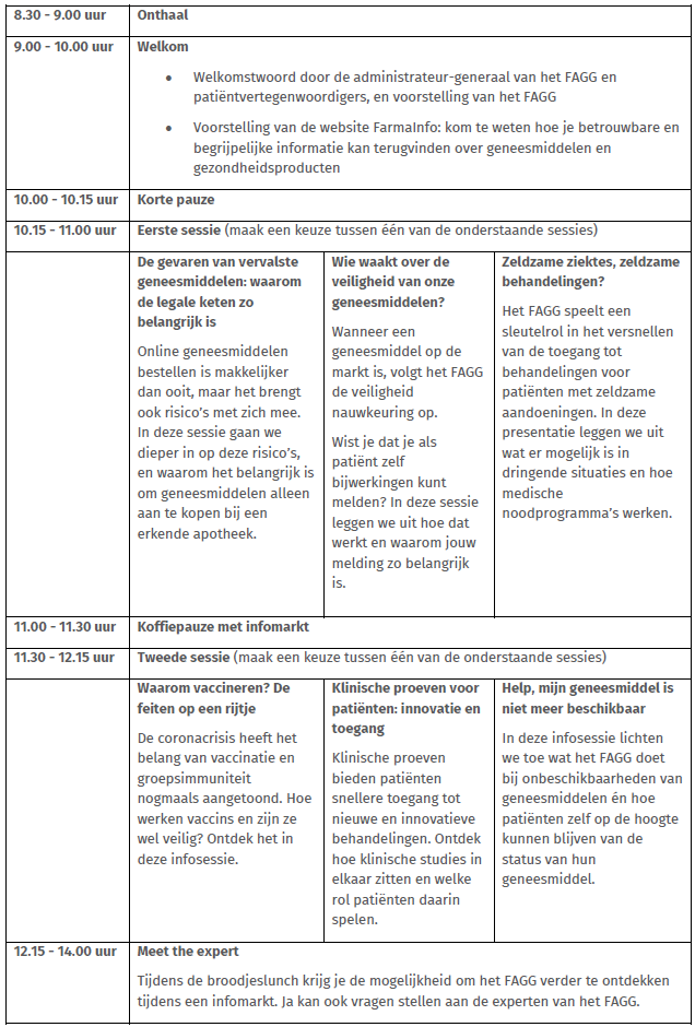 Ze willen graag met jou in gesprek gaan over hoe geneesmiddelen en gezondheidsproducten beter kunnen aansluiten bij jouw noden. Na de presentaties is er een lunch voorzien waarbij je op een informele manier al je vragen kan stellen aan de experts.